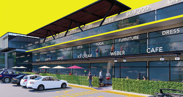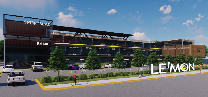 La nueva plaza comercial LE’MON PARK es un proyecto que contará con diversos servicios como oficinas, restaurantes, tiendas, y un gran espacio de estacionamiento.